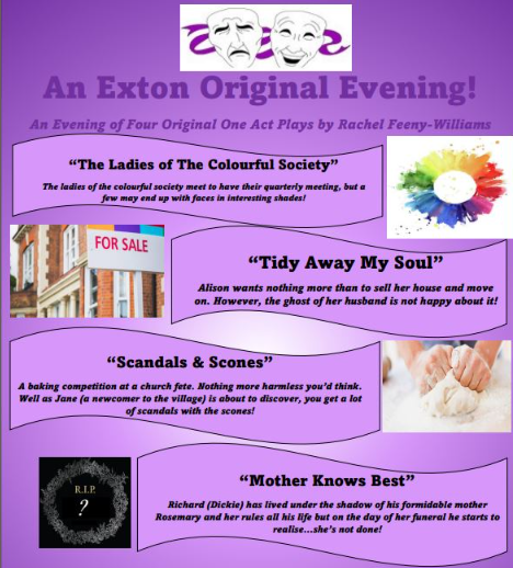 October saw the resident playwright of Exton Drama Club, Rachel Feeny-Williams directing four short comedy plays. This event saw lots of newcomers to the society and a lovely time was had by all!